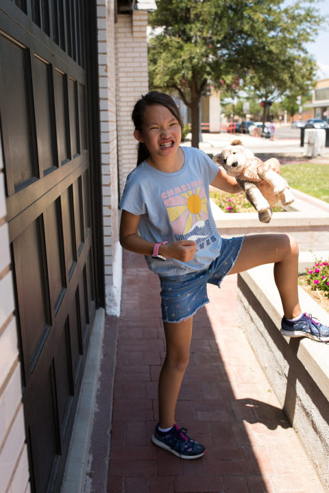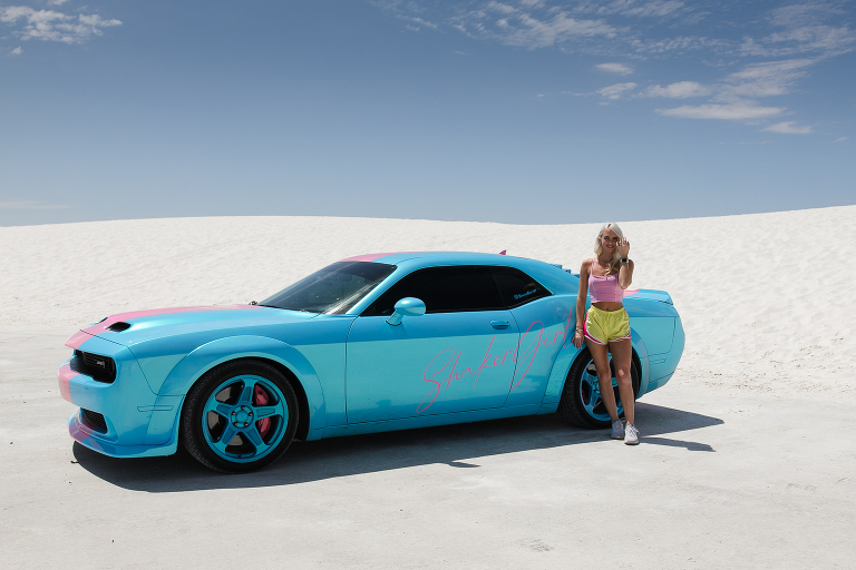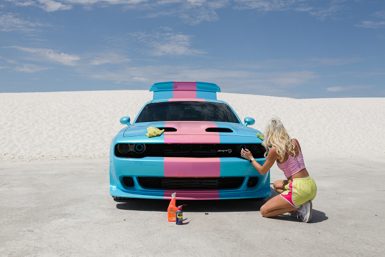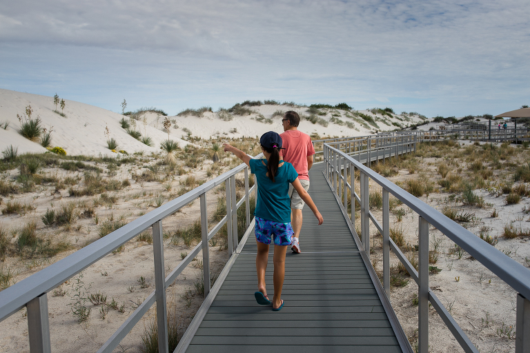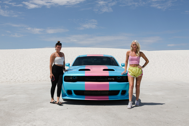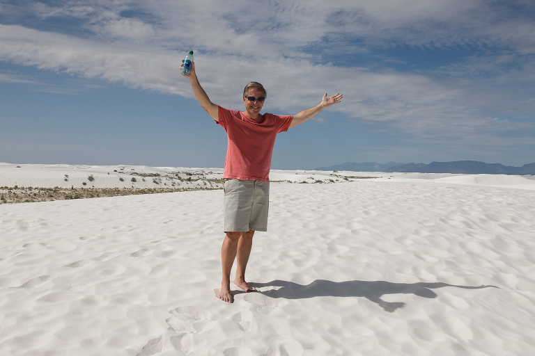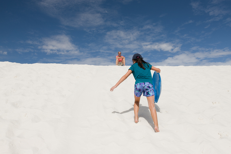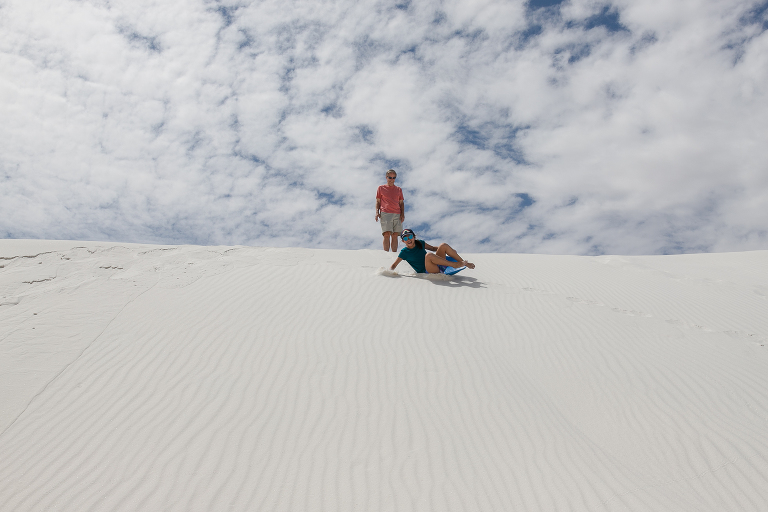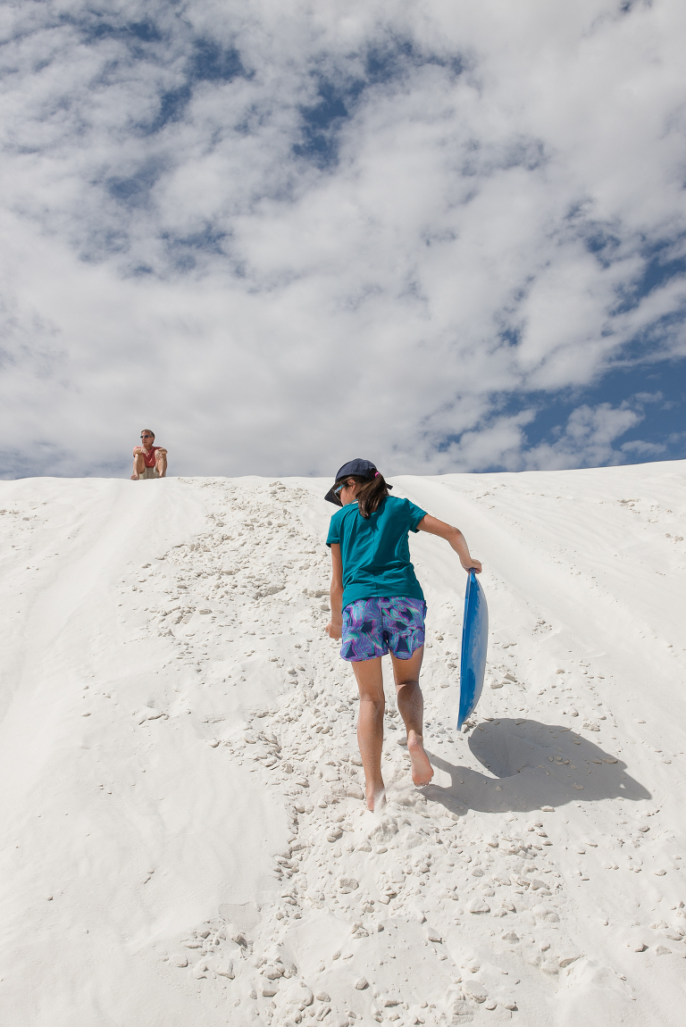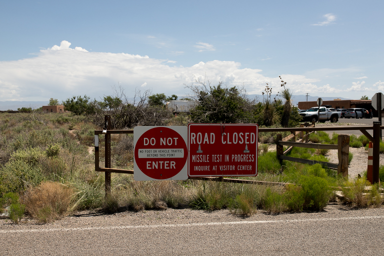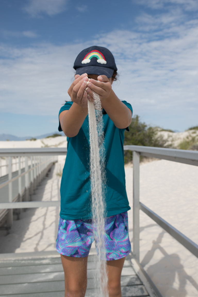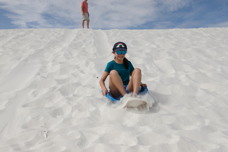 Since we were already in New Mexico, we decided to drive a couple of hours to White Sands National Park. Again, someplace I had never heard of before this summer! Well, it is quite an unusual place to experience. This is not the hot, white sand you may be used to on your vacations. This is gypsum sand, which means it’s cool to the touch. You can walk and walk and walk on it and your feet don’t get hot. That’s not to say it wasn’t SCORCHING on this July day we visited the park. 95 degrees with an even higher heat index means it was HOT. So hot that when you checked in at the park, the ranger suggested that every person have a least a gallon of water to drink while exploring around the park and… sledding. Yes, sledding. The park is known for visitors sledding down the hills just like we do during the winters on snow hills here in Chicago. So, we grabbed a sled and headed for the gypsum hills. That ranger was right. It was so hot that every time Emily slid down the hill, I’d hand her the water bottle for a big drink. Then, back up she’d go again. And those hills were HARD TO CLIMB!!!! We’d stay in a spot for 15-20 minutes, then get in the air conditioned car and drive to a new hill. Then repeat. After a couple of hours, we were headed out of the park on to our next destination when we noticed this bright pink and blue car down the road. There were two college girls cleaning the sand off of their car before getting back on their summer road tip. ( We took the lazy way out and found a car wash!) That car was so cool looking, especially with the bright white backdrop, that I had to ask to take a photo. And a mention about the last photo– missile testing. White Sands National Park is surrounded by the White Sands Missile Range. A military testing area operated by the Army. Lucky for us, the gate was open the day we arrived! LOL