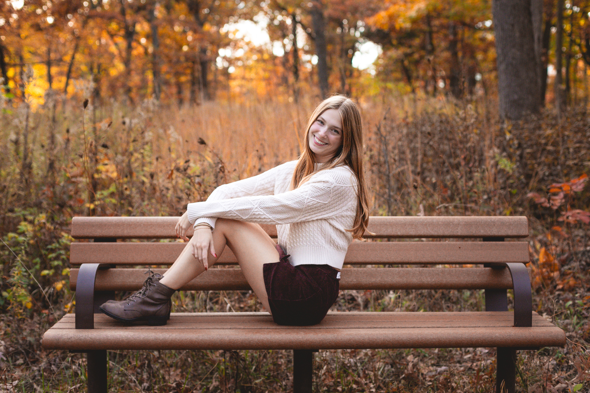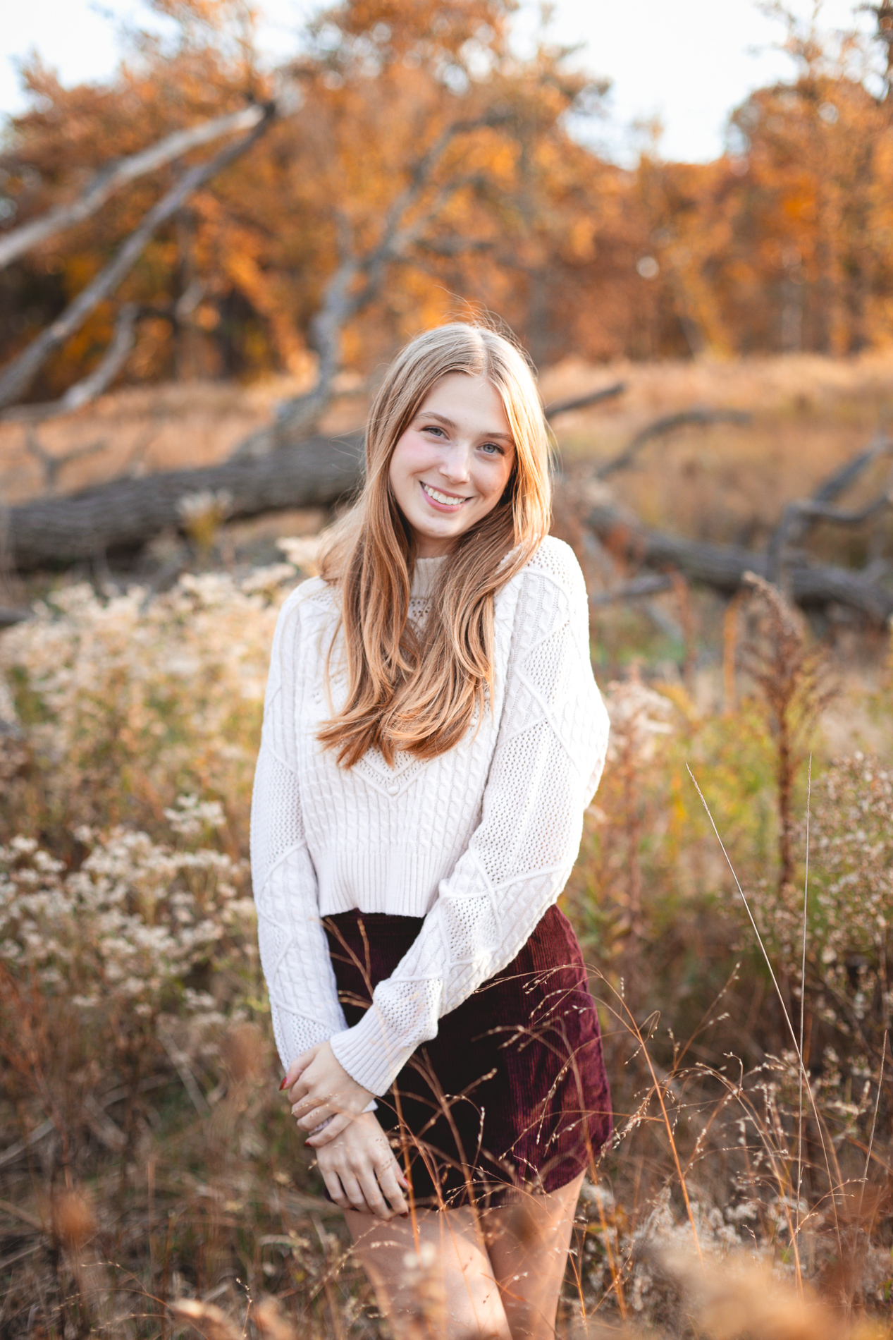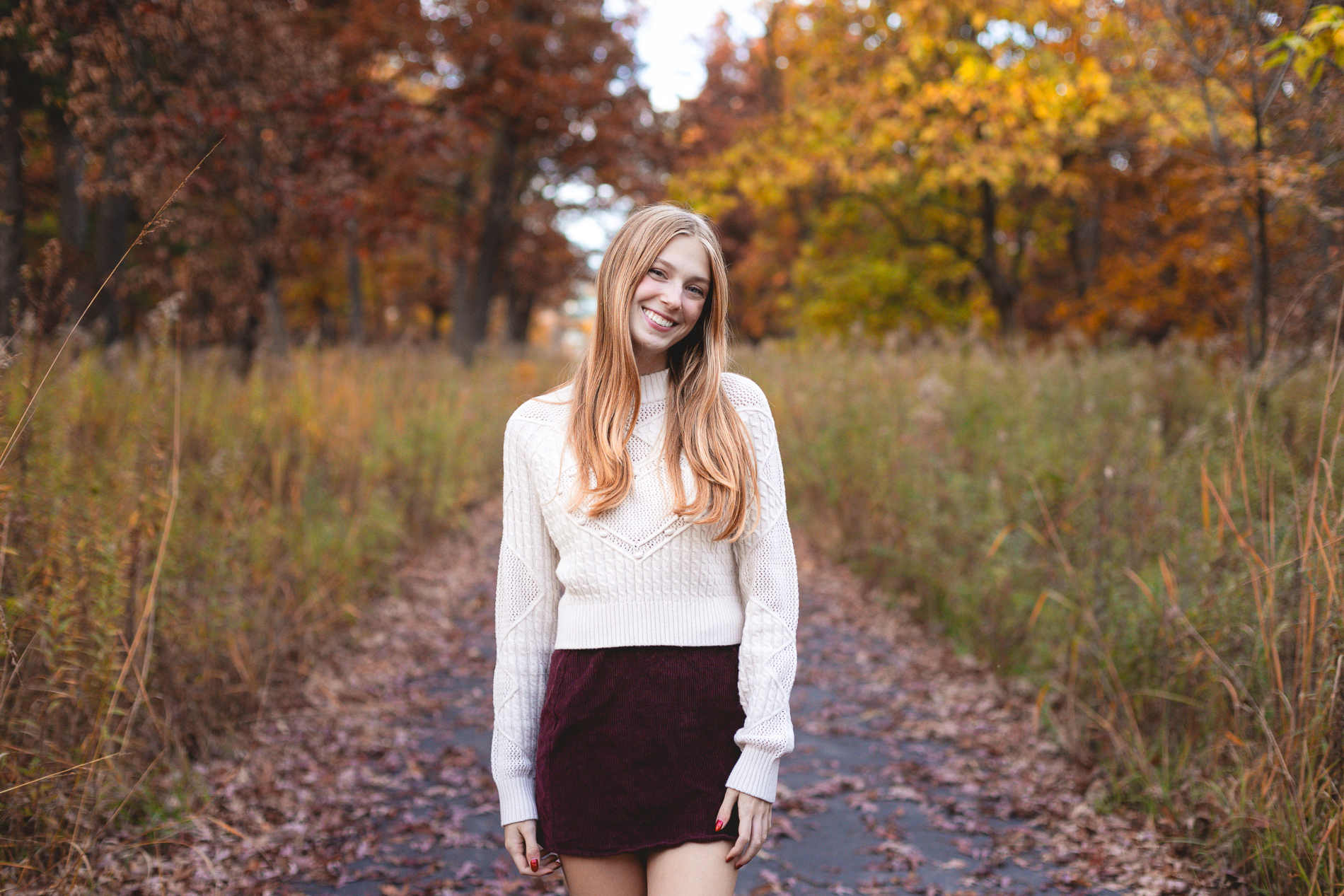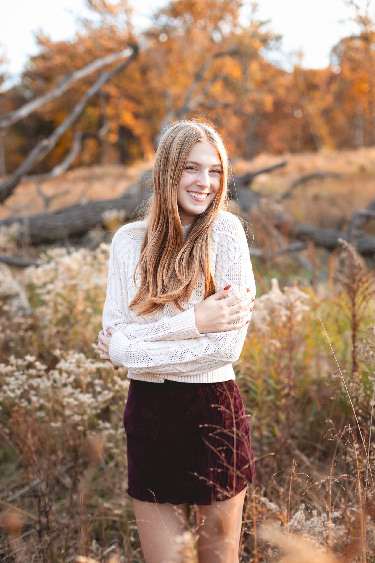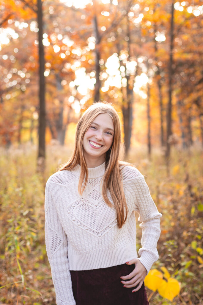 The glorious color of fall. Add in the soft light of an October sunset and you have the recipe for some gorgeous photos! Our senior photo shoot series with this beauty continues from fields of flowers and sandy beaches to a forest of fallen leaves.