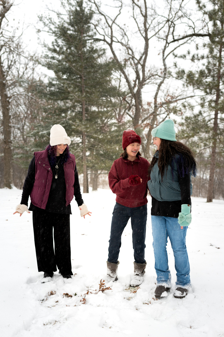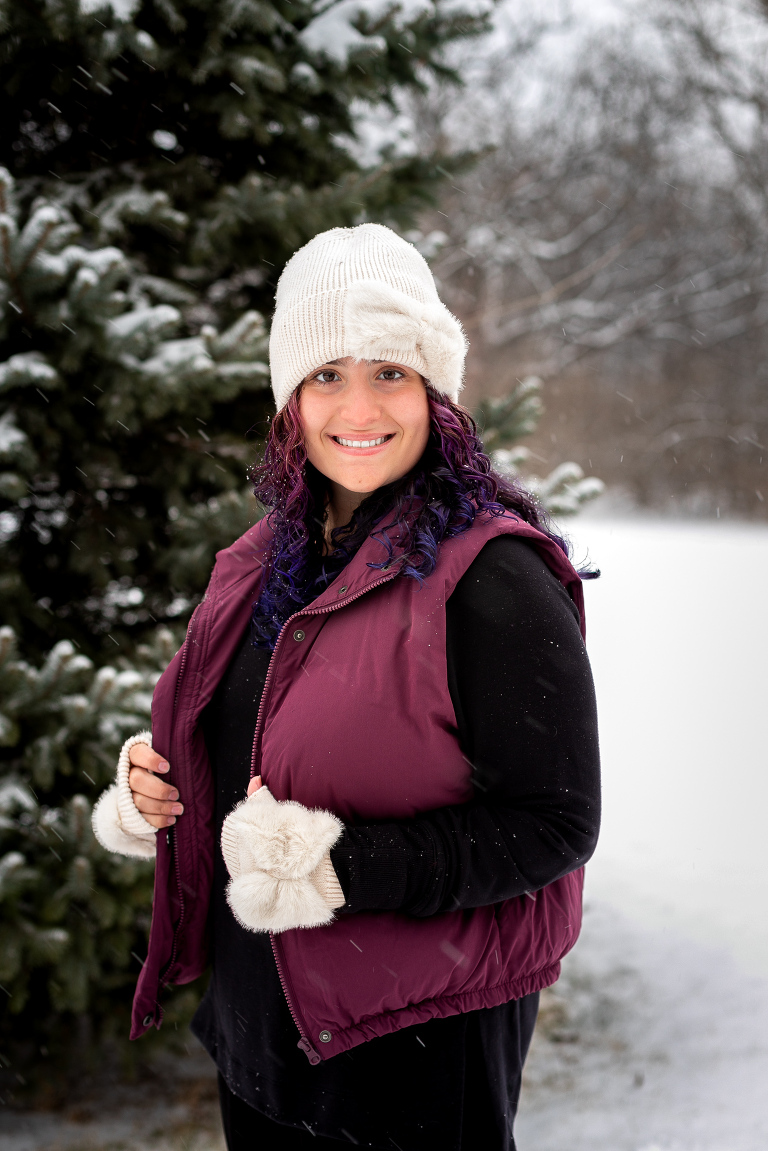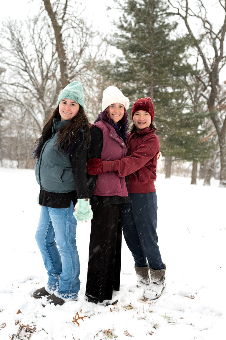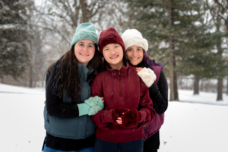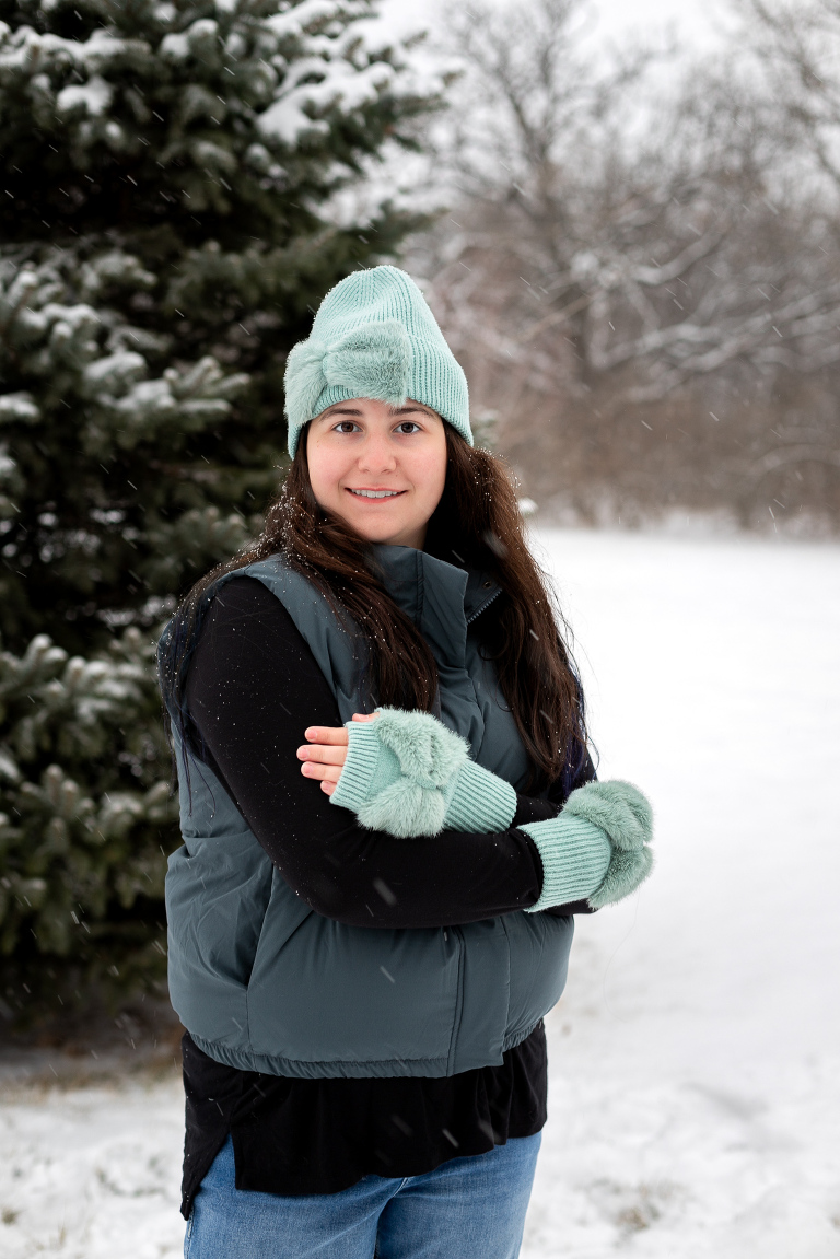 I was shopping one afternoon with a friend of mine when we both spotted these adorable fur hats with matching fingerless gloves. Almost simultaneously we both said- winter snow photos! Those hats and gloves sat on closet shelves for some time, but finally, last weekend we had a beautiful snowfall and just enough time after school to get the girls out for a couple photos.