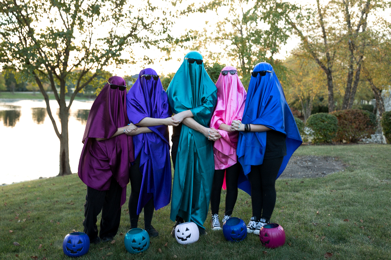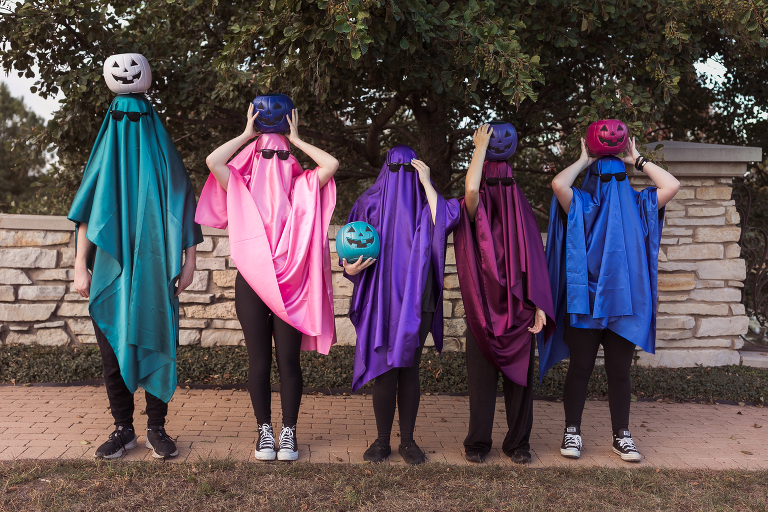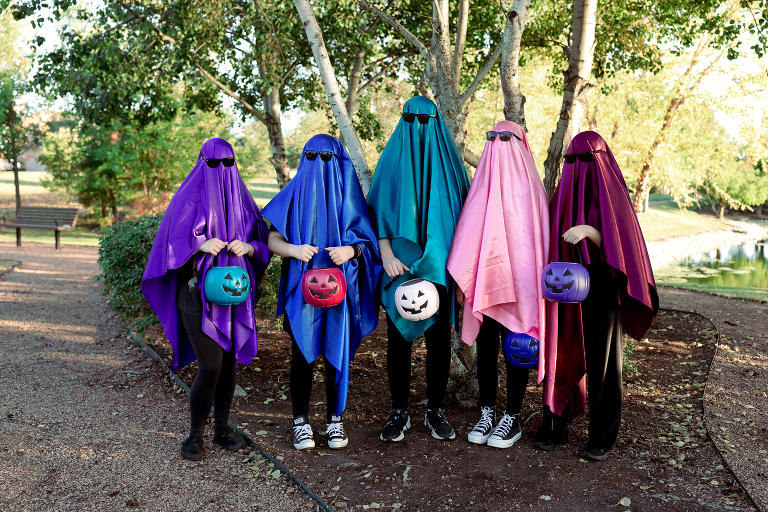When a friend of mine suggested some Halloween fun, it took me a nanosecond to say YES! We got our kids together and draped them in colorful sheets, black “Blues Brothers” glasses and look at those pumpkins they’re all holding! She and her daughters painted those generic orange trick-or-treat pumpkins you find everywhere this time of year, super fun colors to coordinate with our “Ghosts Photoshoot”. They turned out super cute. We had such a fun time and are already planning our next shoot… hmmm… maybe something Christmas holiday…. 🙂